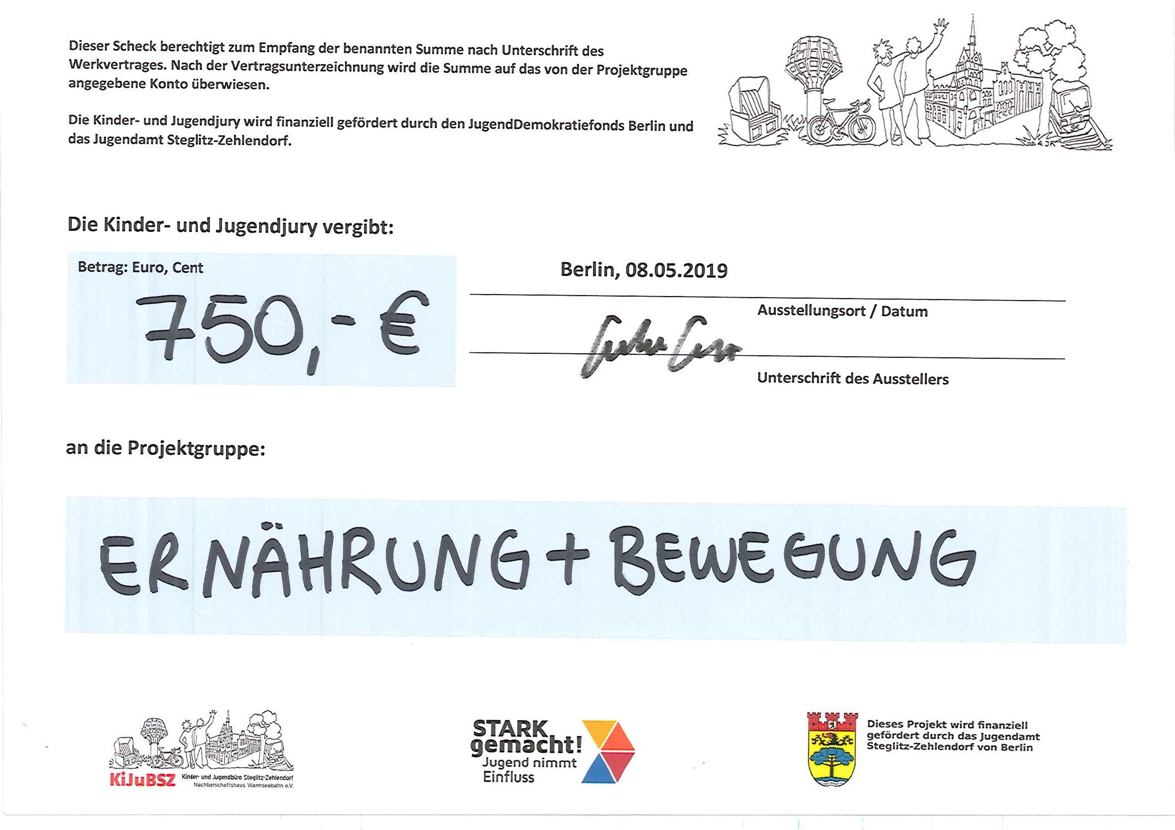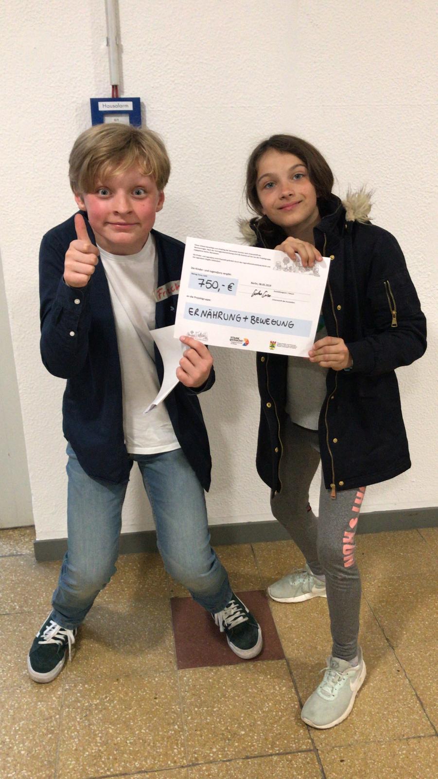 Die Projektgruppe Schülerbücherei/Schülerpartizipation freut sich, dass ihre Vertreter bei der Kinder- und Jugendjury 750 Euro für das geplante Projekt "Ernährung und Bewegung" erhandeln konnte. Neben vielen anderen dort vorgestellten Projekten konnten Kira und Friedrich sich überzeugend für dieses einsetzen. Während der Leseprojekttage im Januar dieses Jahres haben die beiden dort nicht nur gelesen, sondern auch erfahren, wie die Bücherei aufgebaut ist und welche Aufgabenbereiche es gibt. Außerdem engagieren sich beide für mehr Beteiligung der Schüler und Schülerinnen am Schulleben. So nahmen sie sich am 8.05.2019 die Zeit – Friedrich strich sogar sein Basketballtraining – und suchten die Kinder- und Jugendjury im „KiJuBSZ“ auf. Dort konnte man sich mit einem Projekt bewerben und bis zu 800 Euro Unterstützung erhalten. Die Kinder- und Jugendjury wird durch den JugendDemokratiefonds Berlin finanziell unterstützt.
